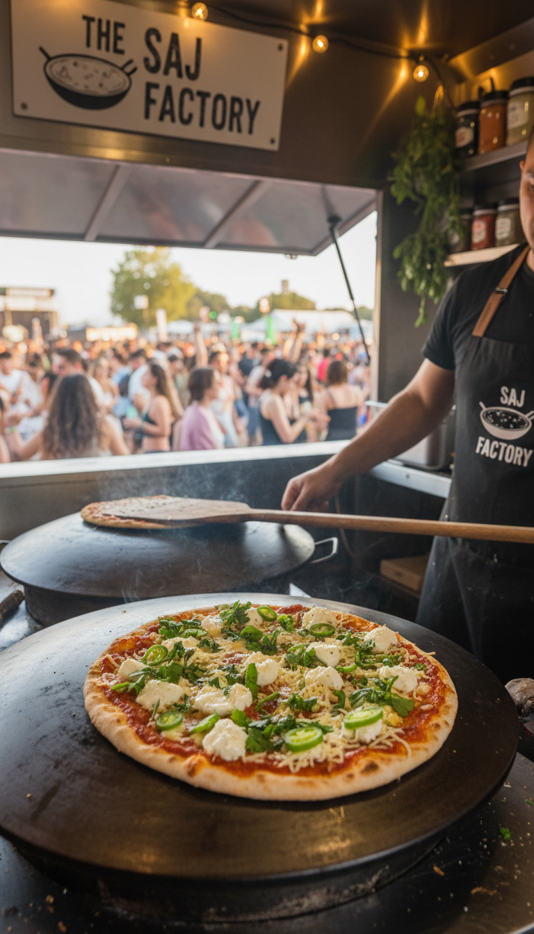 We run a high-volume saj and flatbread kitchen for music festivals and large events, serving fresh, veg-forward comfort food fast, with full open-kitchen theatre and long-shift festival experience.