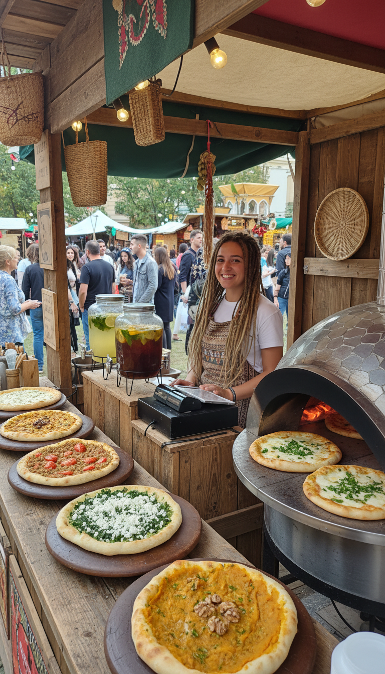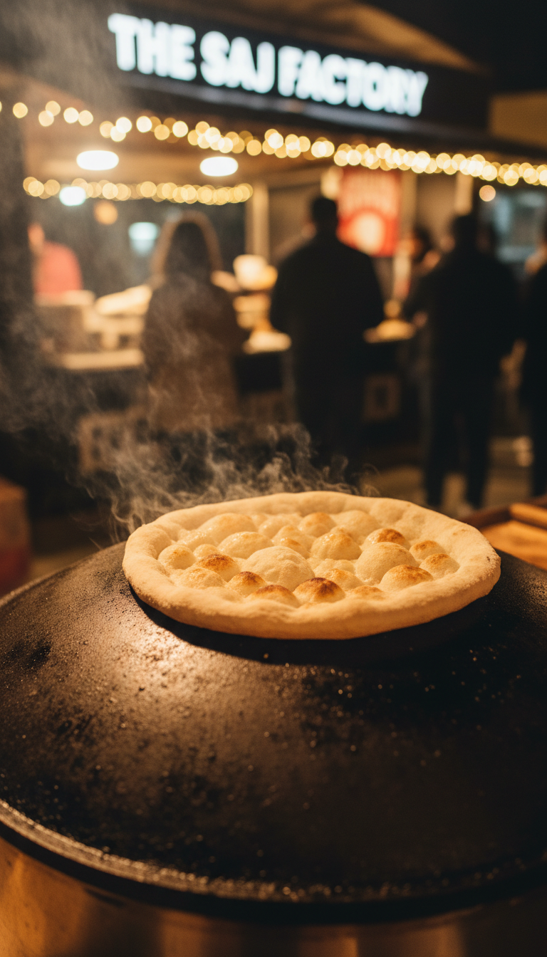 Compact Saj Factory setups for street markets, food fairs and city events. Flexible menus for locals and tourists, from quick pita-in-hand snacks to sharing plates and sweet saj specials.